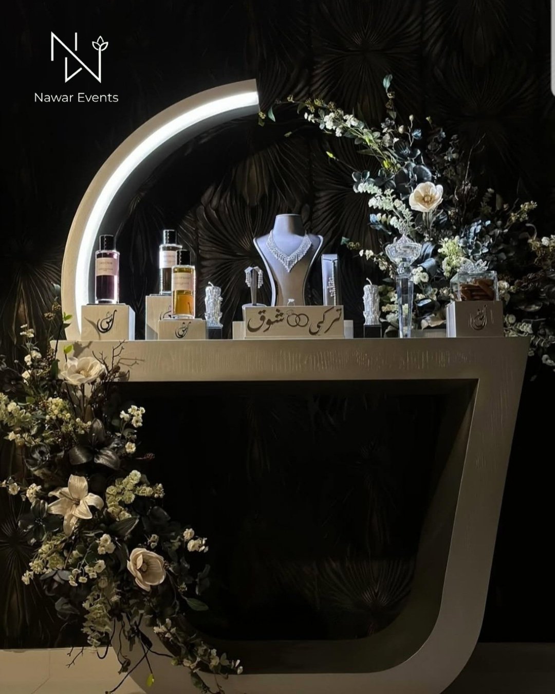 الدزة شاملة الطاولة و التنسيق بالورد الطبيعي (اللون حسب اختيار العميل) مانيكان لطقم العروسة، اكريليك اسامي العروسين (حسب تصميم العميل)، ٣ ستاندات للعطور و ستاند للعود، مبخر